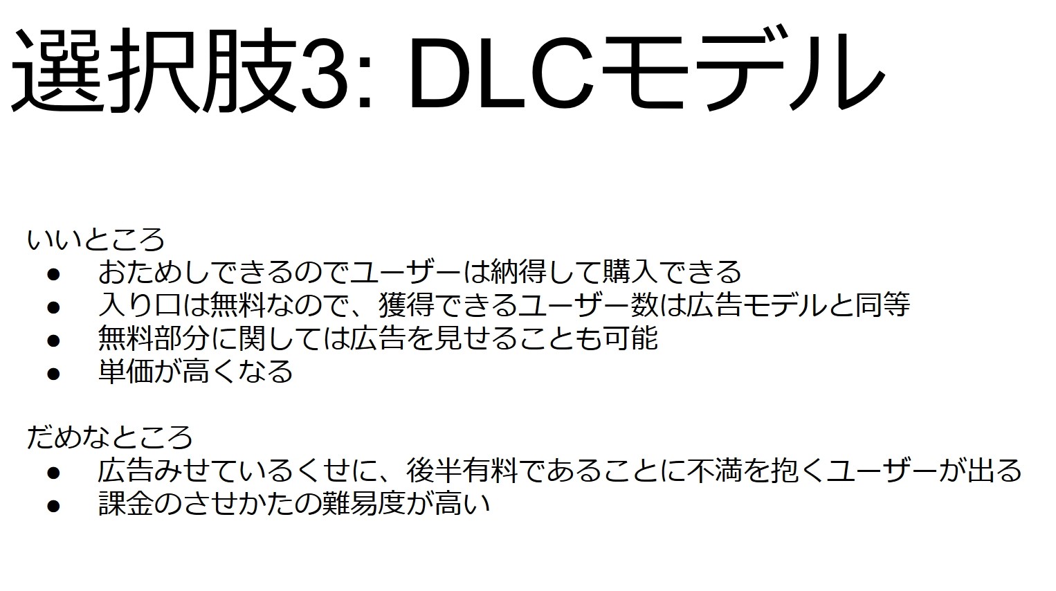 DLC(基本無料)は、お試しできて、入り口が無料だから広告モデルと同じだけプレイヤーが獲得できる。しかし、無料部分を遊んだ後に有料部分が出ると不満を抱くプレイヤーがいること、課金設定の難易度が高いことが問題となる。