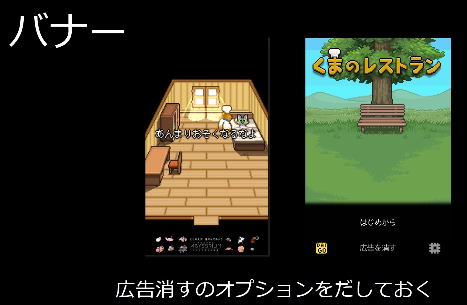 そこでプレイヤーに対して最初に「広告を消す」という選択肢を表示することで、買い切りゲーム派のプレイヤーにも、広告で遊びたいプレイヤーも、納得して遊べるように気を付けたという。