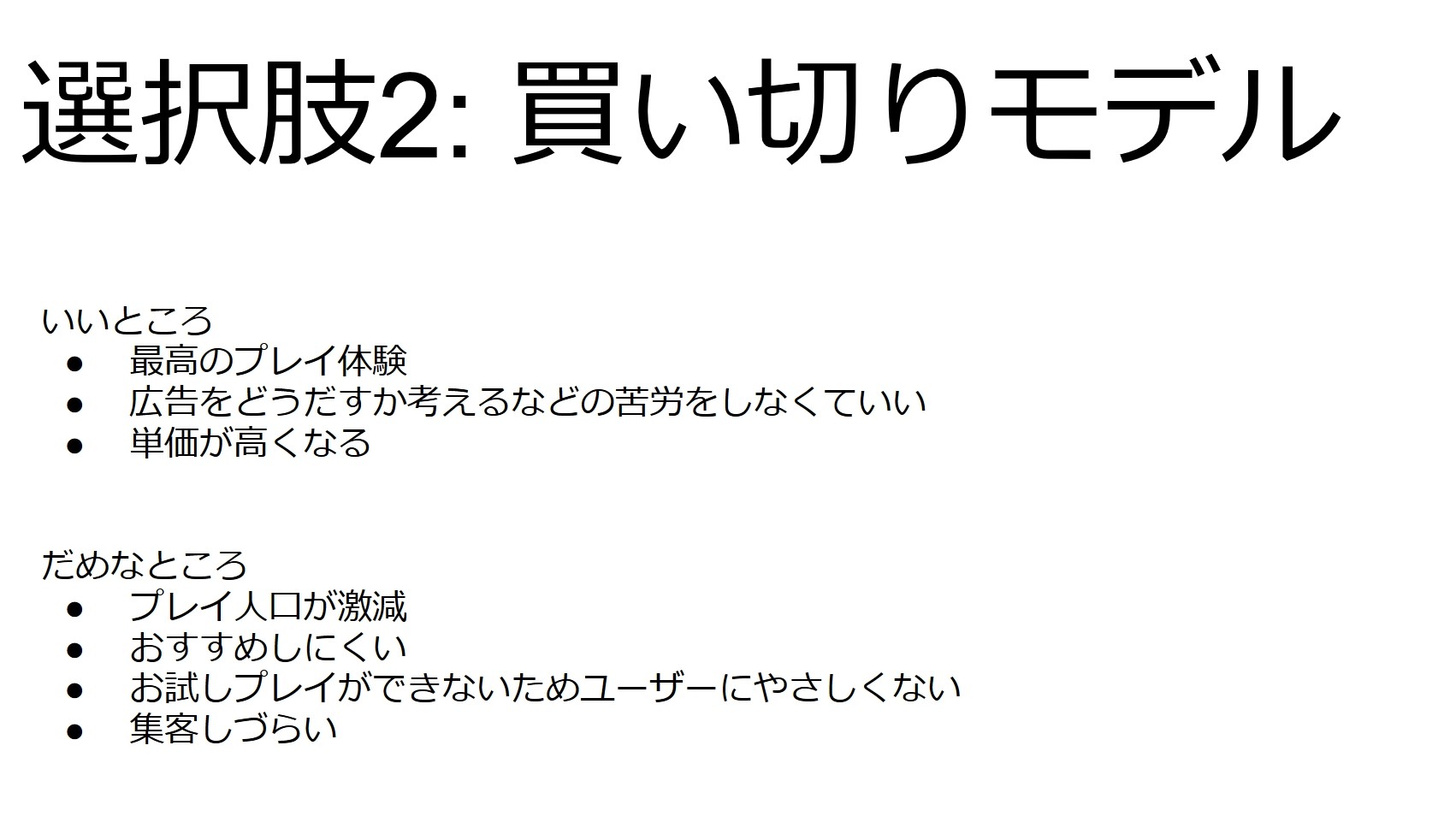 買い切りだと最高のプレイ体験を提供できるが、プレイ人口が減る。お試しできないし、広まりづらい(友達に有料ゲームを進めてもらいづらい)。