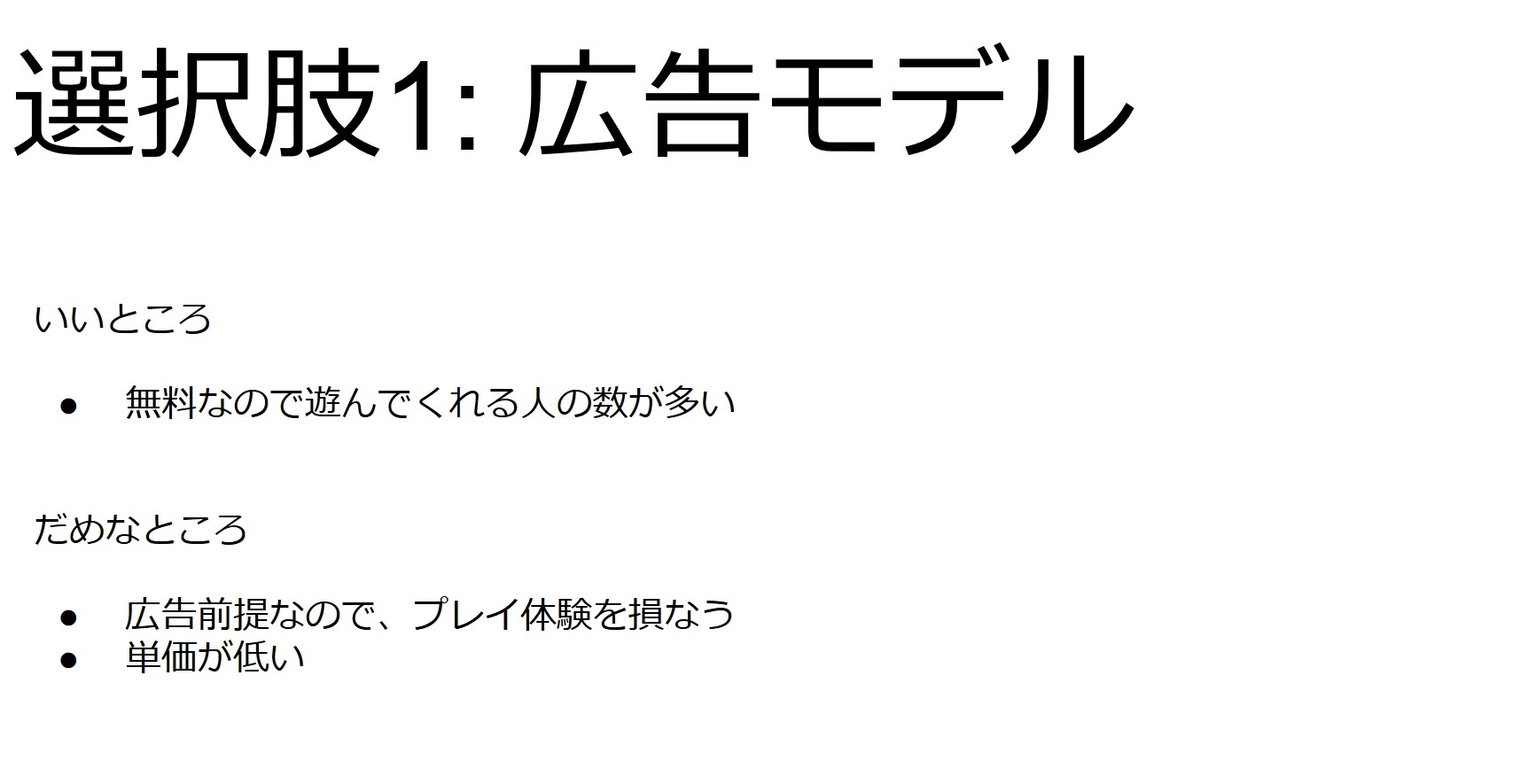 広告・無料だとは、無料なので遊んでくれる人が多いが、単価が低く広告でゲームが阻害される。