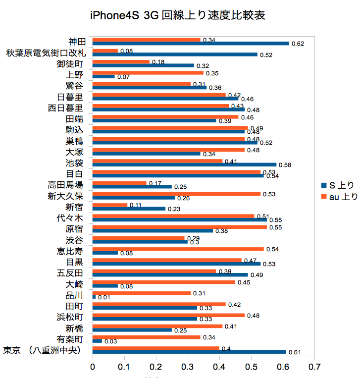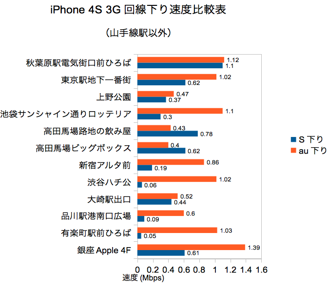 東京都内の au と SoftBank の iPhone 4S パケット通信速度を比べてみた。