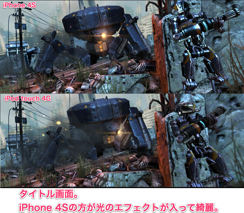 iPhone 4S だと光のエフェクトなどが追加されて美しいが、iPod touch 4G などでも映像の質を落としてスムーズに動くよう工夫されている(ただし、iPod touch でプレイすると落ちることが多いようだ)のも良い。