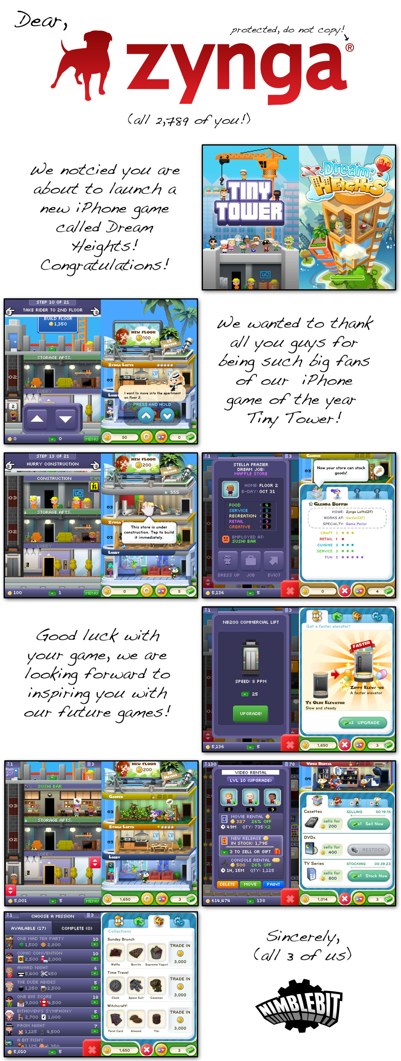 Tiny Tower developer goes on the offensive over Zynga's new iOS freemium tower-building game Dream Heights | Dream Heights(Pocket Gamer)