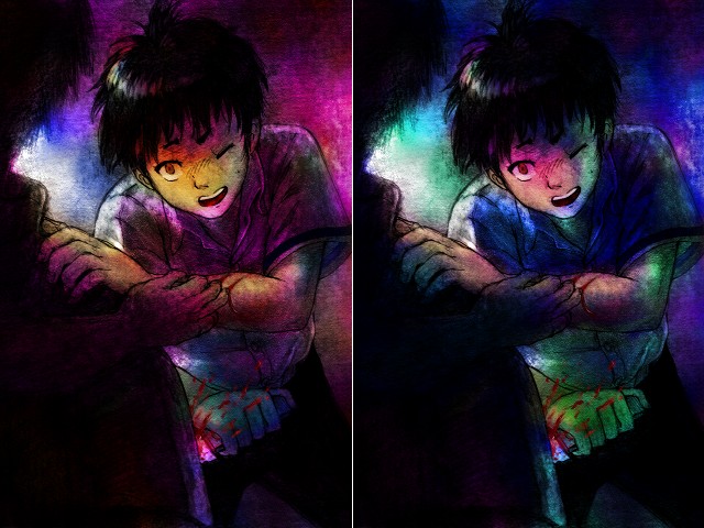 なんと、イラスト担当ではない2人も画像処理ソフトをいじって画像の色調を変えていた。