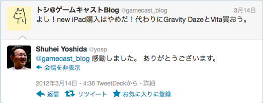 が、あまりにGRAVITY DAZEの評判がよく、ついつい「new iPad購入はやめだ!代わりにGravity DazeとVita買おう。」とツイッターで呟いたところ、意外なところから返事が来てしまった。