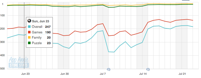 いやはや、恐るべき効果だが、このゲームはAppStoreに登場時、USで2週間連続売上1位を獲得しており、無料プロモーションが非常に効果が大きかったかというと、全体から見ればそこまでではないのだろう。