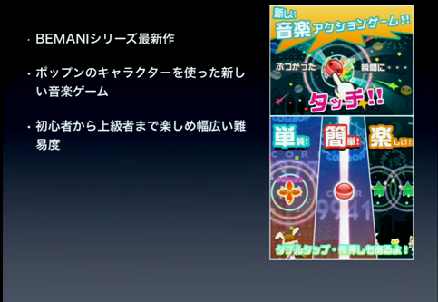 そのiOS版は…「ポップンのキャラクターと曲を使った新しいゲームになります」と発表された。