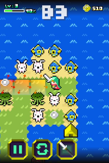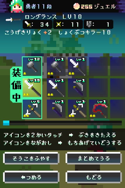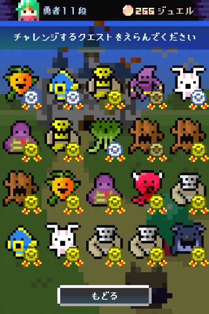 ドット絵の動きや、勇者とお供のボイスもかわいいし、1ステージ数分の短い時間でも遊べるスマホらしさもある。