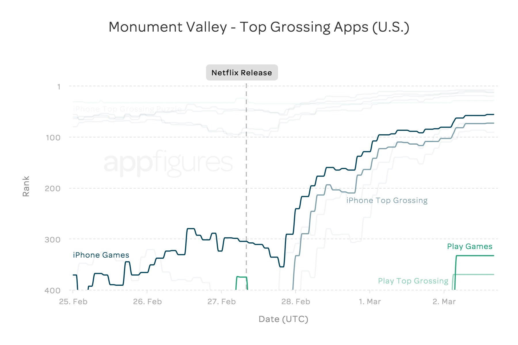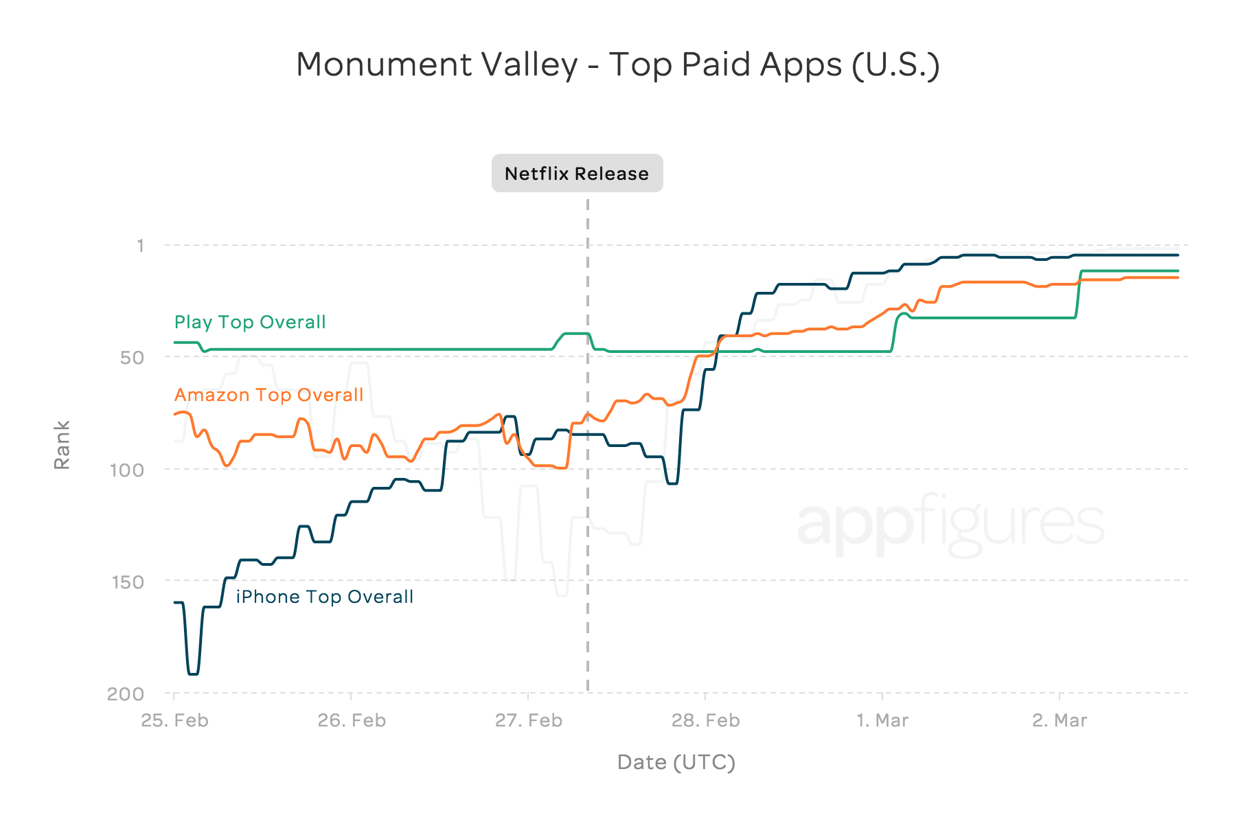 appFiguresの記事によると、『Monument Valley』の人気が再燃したのは、Netflixの人気ウェブドラマの人気ドラマ「House of Cards」シーズン3で使われたためだそうだ。
