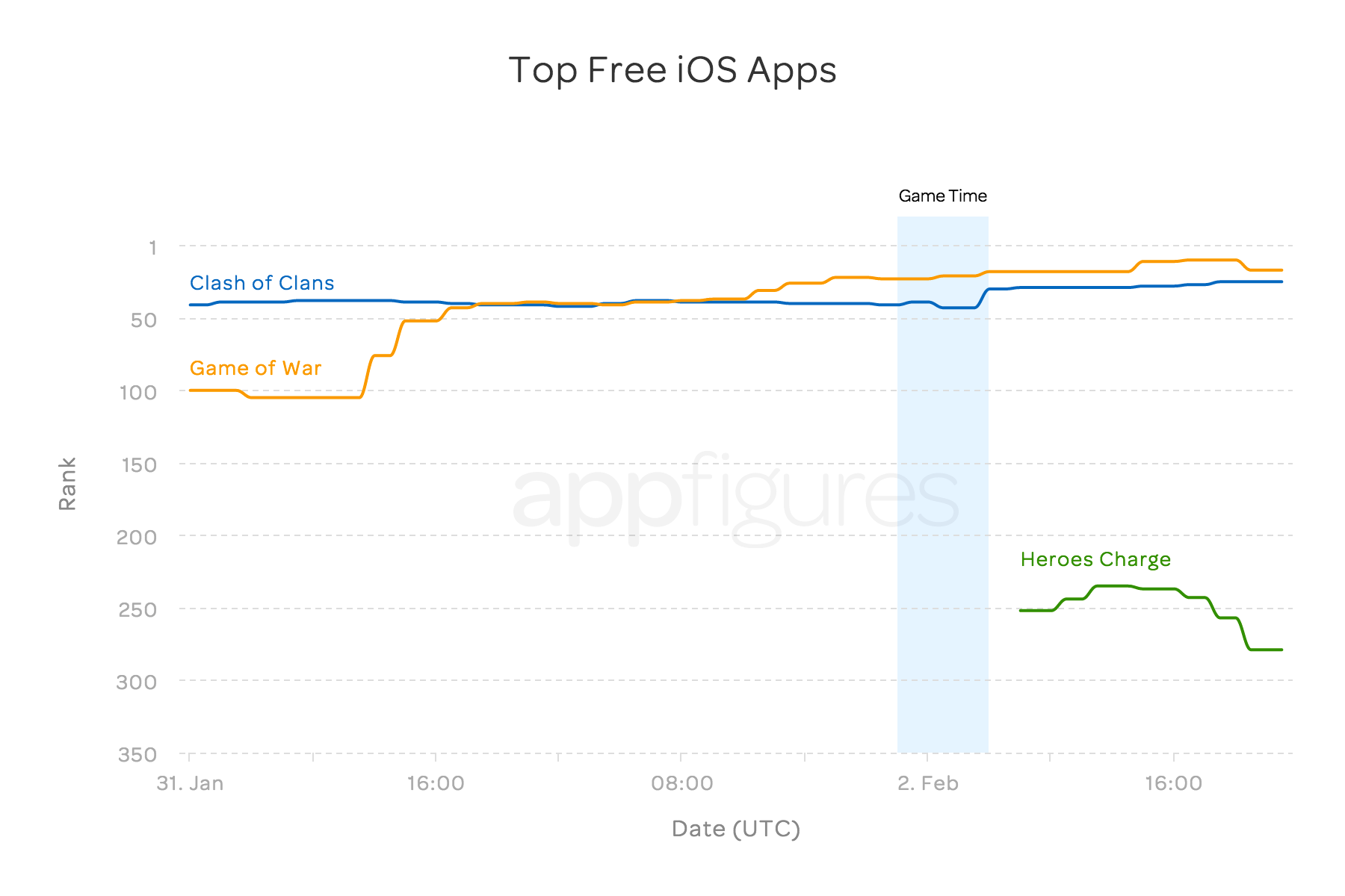 しかし、スーパーボウルでは『クラッシュオブクラン』、『Game of War』、『Hero Charge』 の3アプリが広告を出したものの、前者2つは知名度がすでに高かったためかあまり効果がなく、『Hero Charge』もほどほど程度の効果だったそうだ。