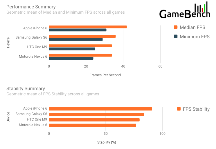GameBenchにてiPhone 6(2014年9月発売)、 Galaxy S6(2015年3月発売)、HTC M9(2015年3月発売)、Nexus 6(2014年12月発売)のベンチマークテストを行った結果判明した。
