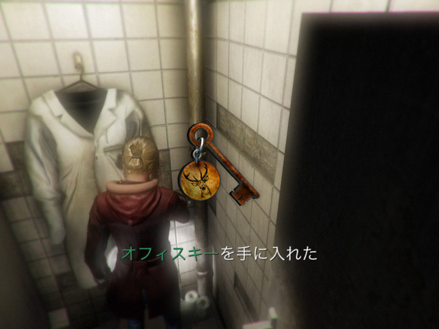 男性トイレのドアがあるので、入って正面のトイレのドアを開け、コートから「office key」を入手。