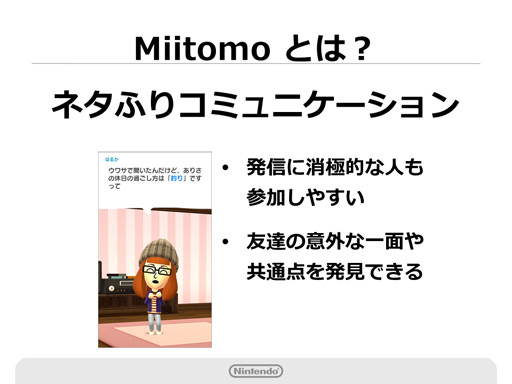 また、Miiを介してプレイヤー同士が受動的にコミュニケーションを取る仕組みを用意するという。