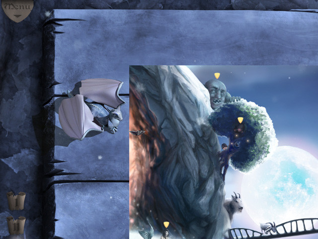ゲームを起動すると古めかしい本が登場し、メニュー画面へ。青白んだ世界が、神秘的な空気感を演出する。