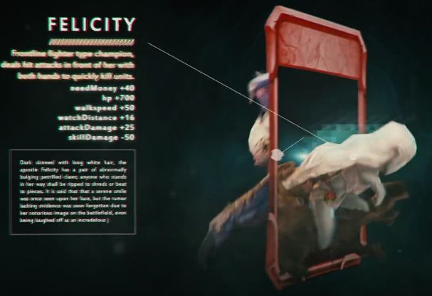 さらによく見ると、NeedMoney(必要資金)、HP、Walkspeed(歩行速度)、WatchDistance(視界)、AttackDamage(攻撃力)、SkillDamage(スキル攻撃力)の6つのパラメーターが動画から見て取れる。