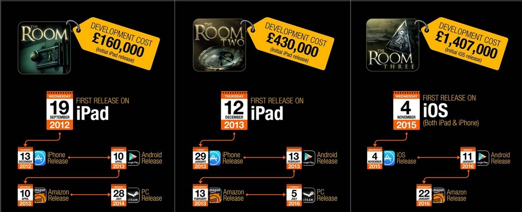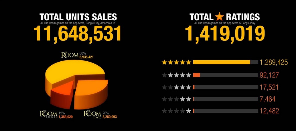 60%が『The Room』、28%が『The Room TWO』、12%が『The Room THREE』となる。The RoomについてはAndroidで体験無料版が出ており、Appleの無料プロモーションもあったので、その影響でダウンロード数が多いと推測される。