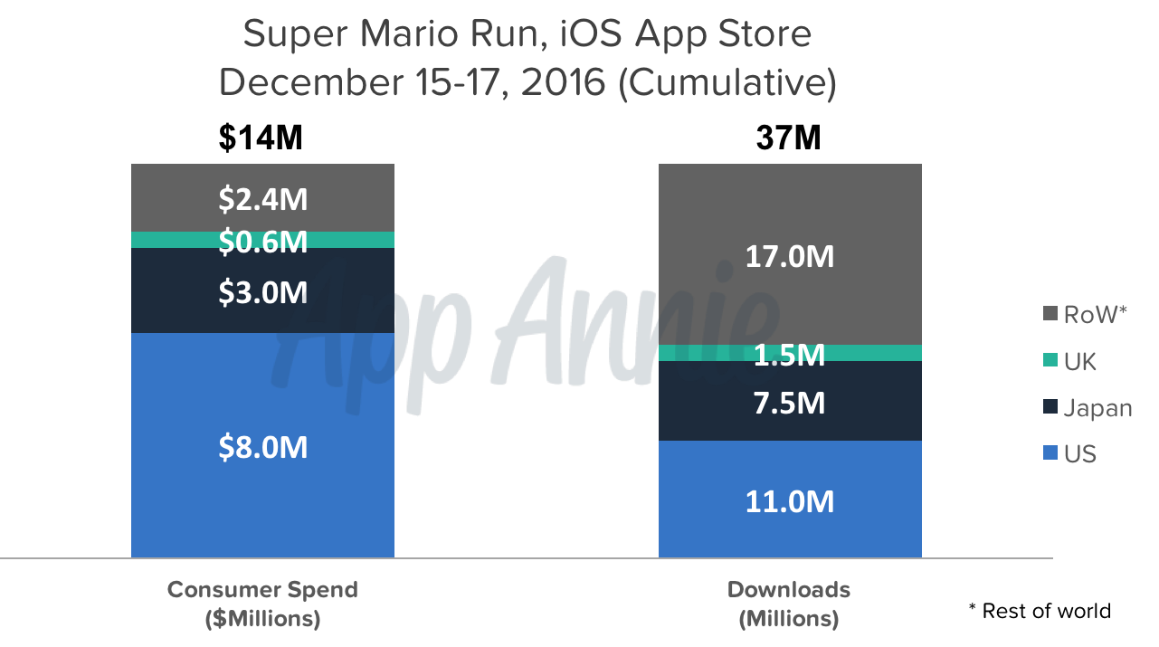 これによると、スーパーマリオランのダウンロード数は3日間で3,700万、売上げは1,400万ドル(およそ16.5億円)となっている。