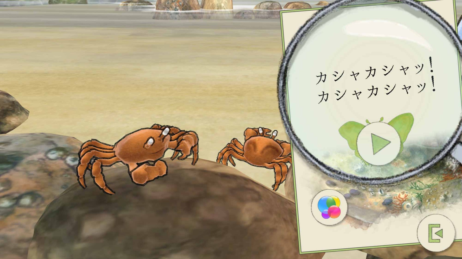 ミニゲームの種類は、全部で7つ。浜辺で虫眼鏡を使って生物を観察したり…。