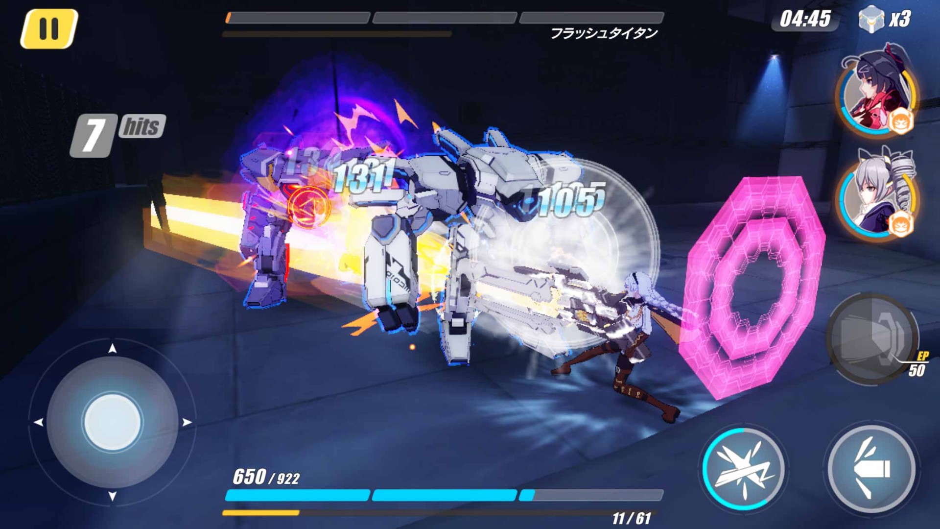 崩壊3rdは、3人でチームを組みキャラクターを切り替えながら戦うステージクリア型のゲームだ。