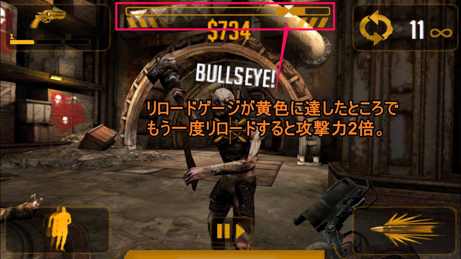 テクニックとして重要だったのは、銃の弾をリロードするとき、リロードゲージが黄色い箇所でもう1度リロードボタンを押すと弾の威力が2倍になるテクニックだ。