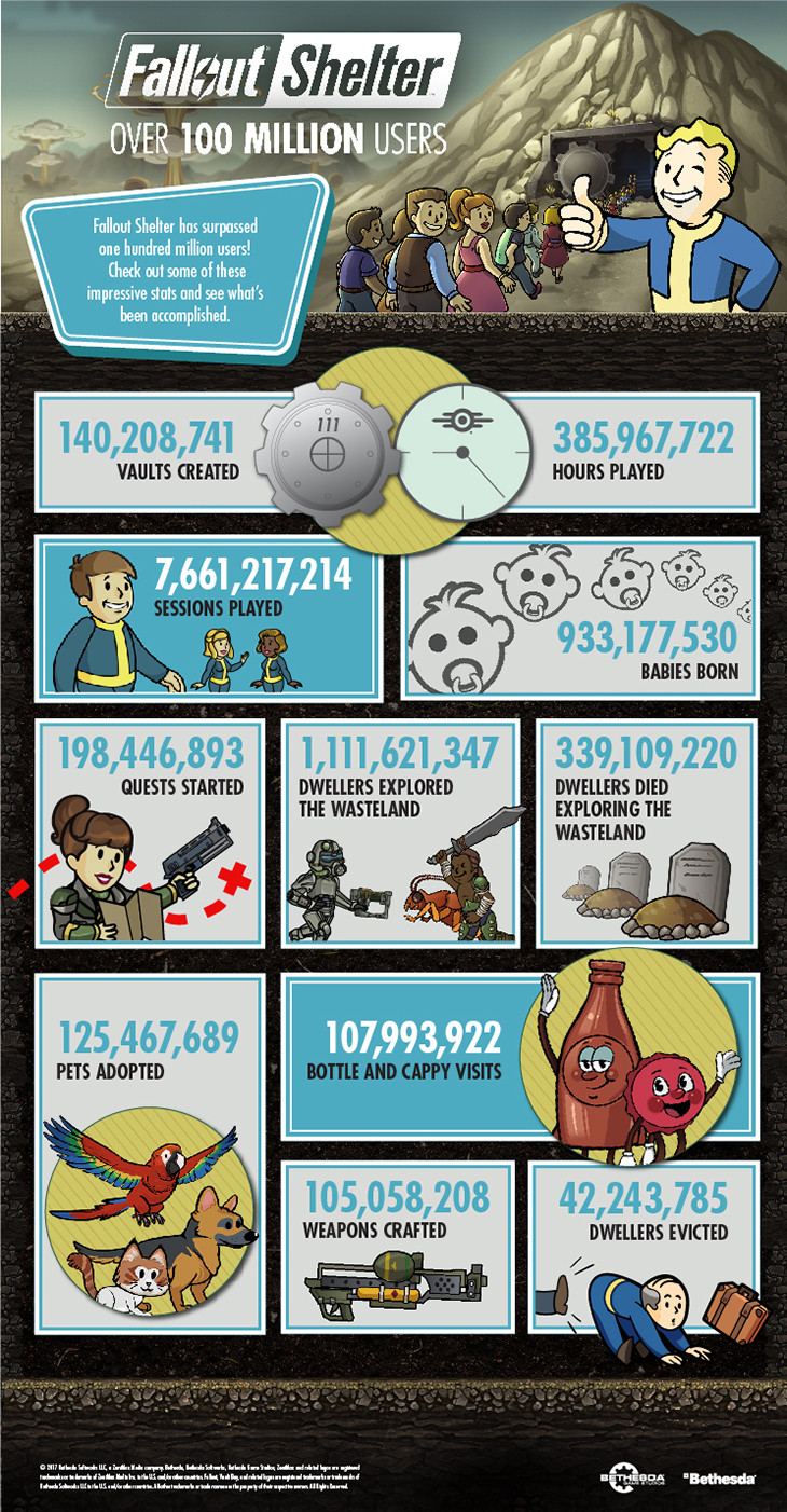 Bethesdaは、公式ブログにて『Fallout Shelter』のプレイヤー数が1億人に達したことを明かし、ゲーム内の様々な数字を明らかにした。