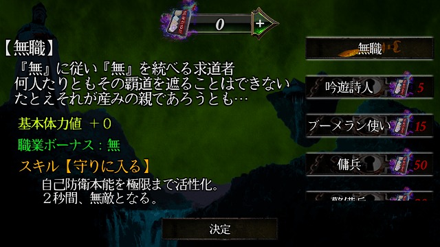 “無職”から、グンマーの戦士“ブーメラン使い”など様々な職業があるが、初期はロックがかかっていて有料アイテムの“謎の札(上毛かるた)”を消費することによって上級職を使えるようになる。