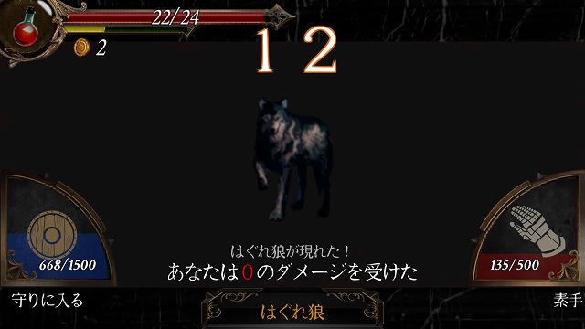 画面右の赤いゲージが最大まで溜まってから赤ゲージをタッチすると、強力なパンチをお見舞いできて、なんとかオオカミを撃退できた。溜まりきらなくてもゲージの残量に応じた強さの攻撃ができるようだ。