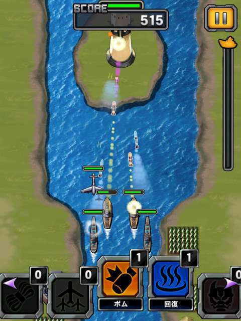 いや、砲台に向かって艦船が進んでいくからタワーオフェンスだろうか。砲撃する相手をタッチで指示したり、援護アイテムを使ったりとゲームはなかなか忙しい。