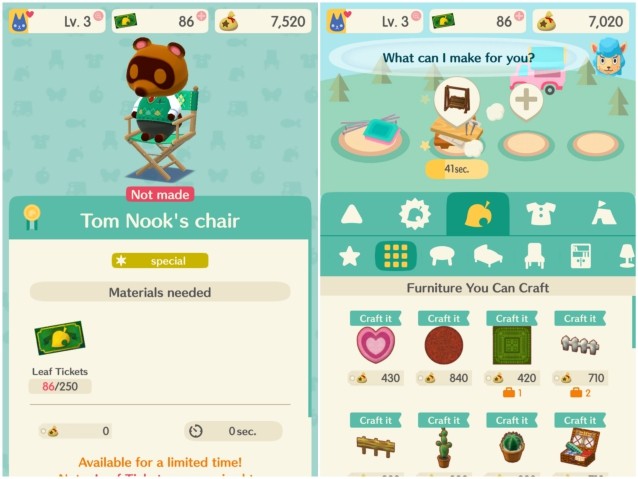 しかし、現在のところ『どうぶつの森』はリーフチケット専用家具が各250チケット×2、家具作成枠拡張80チケット×2。