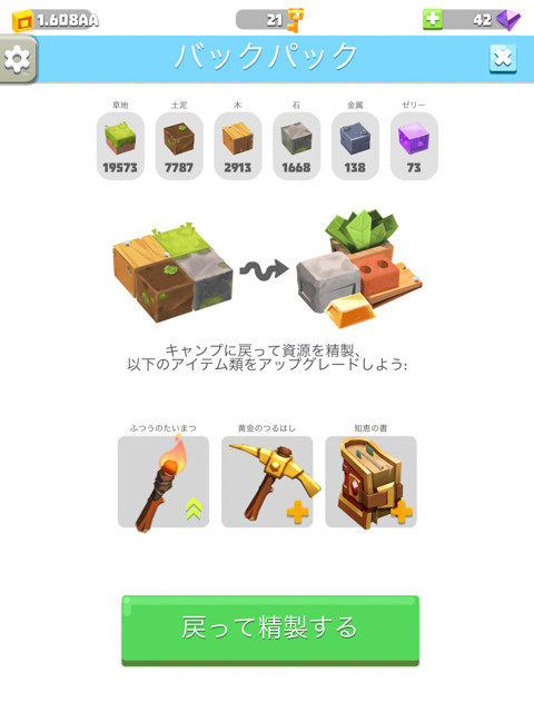 金以外の鉱石はキャンプで素材に変換さされ、アイテムのクラフトに使用できる。