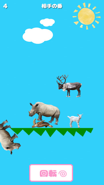 回転ボタンをタッチすると、どうぶつを45度ずつ回転させることもできるのだが、序盤に巨大生物を引いて、斜めに置くだけで相手が困り果てることもある(詰みではない)ほど角度と配置の奥深さがある。