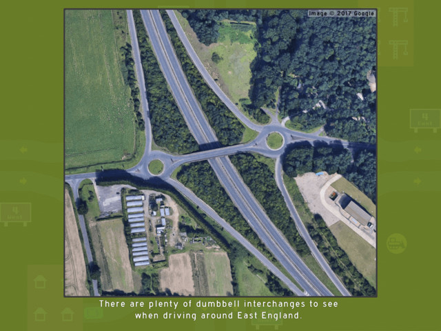 高速道路は高速走行を容易にするため、設計上カーブの曲率や勾配(アップダウン)を緩和した線形としている(中略)インターチェンジ(IC)を用いる。また信号機も使用しない。特に高速道路同士での交差は、ジャンクションと呼ばれる。なるほど、現実の高速道路ではジャンクション(環状の道路を使ってスムーズに合流)させ、カーブを緩やかにしているのか。