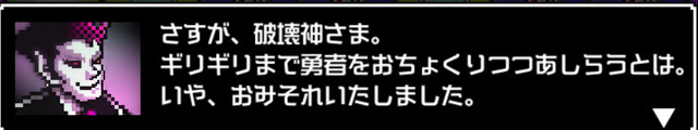 まず、魔王の小物っぷりと異常なハイテンションが楽しい。勇者を倒せば喜び、ステージをクリアすればトラの威を借りて強気なセリフを吐き、いちいち反応が小物可愛い。