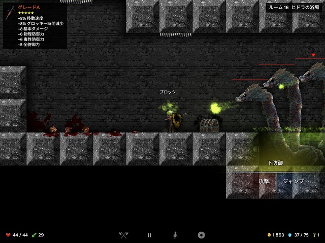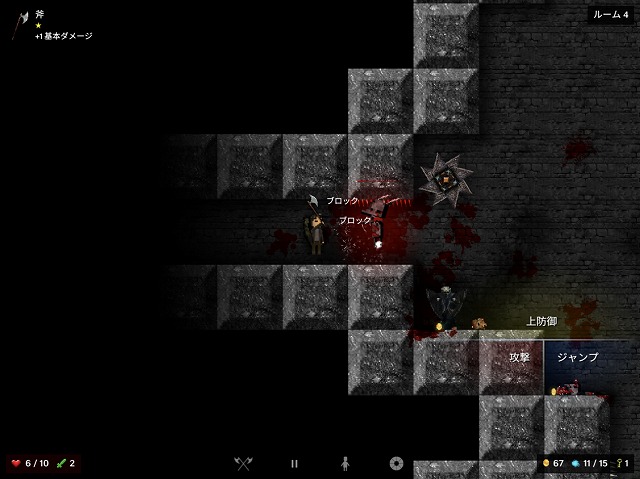 アクション操作はとてもシンプルで、左右キーに加えてジャンプと攻撃、シールドの上げ下げの3ボタンのみ。