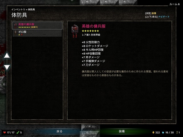 ▲レア防具は特定の武器ダメージを増加させることが多い。たまに最初の部屋に最高レアが落ちていたりしてビビる。