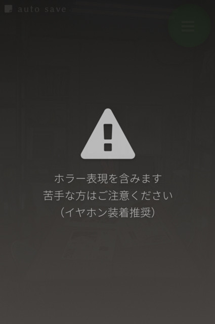 ▲起動時の注意画面。「ホラーの苦手な方はご注意ください(イヤホン装着推奨)」で、怖くしたいのか、やめさせたいのかわからんと思ってしまった(笑)が、実際音は有効に使われていた。