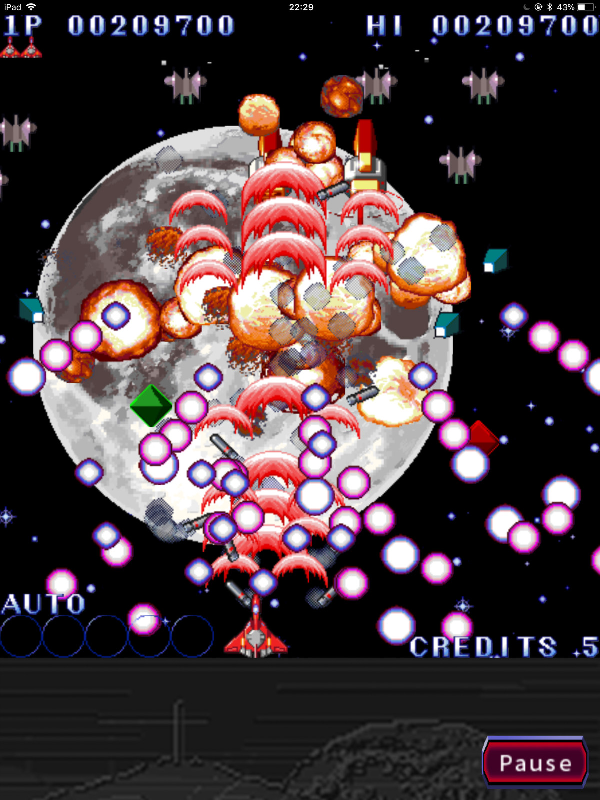 このスマホに最適化システムで、避けて・撃ってを繰り返す懐かしのシューティングが展開される。