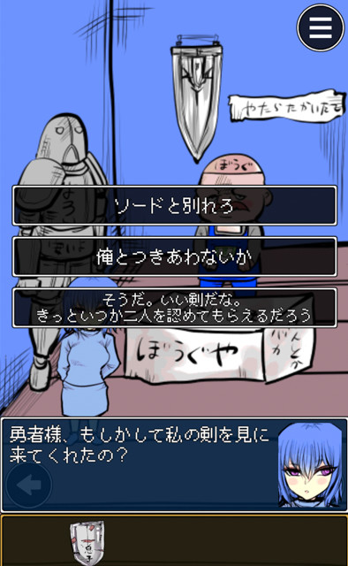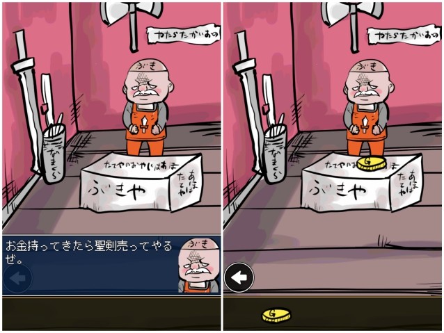 気を取り直して画面下の矢印ボタンからシーンを切り替えると、武器屋の親父が「お金持ってきたら聖剣売ってやるぜ」と。