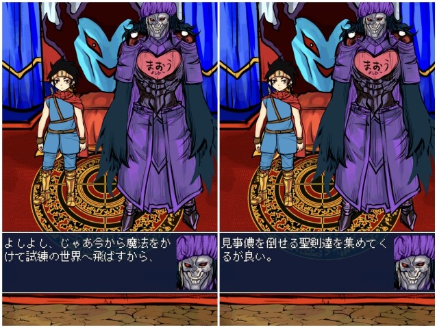 落ち込む勇者を見かねた魔王は「今から魔法をかけて試練の世界へ飛ばすから、儂をを倒せる聖剣達を集めてくるが良い」と、勇者に試練を与えて異世界に飛ばす。