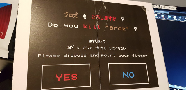 そして、ビームによってブロズのHPをゼロにすると……画面が遮られ、「ブロズをころしますか?」という選択肢を描いた看板が演者の手によって示された。