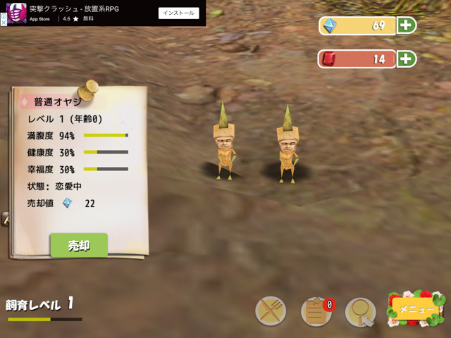 あとはもうこの繰り返しで、餌を置いて成長を見守り、成長したオヤジをタッチしてCPを稼ぎ、“おじさん向け登り棒”やら、“キノコの原木”やらのアイテムを購入して水槽の環境を良くしてオヤジの新種をコレクションし続けることになる。