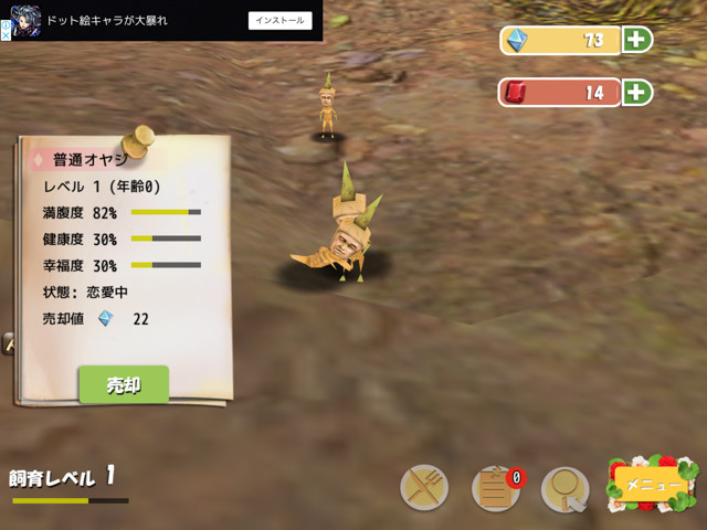 こうしてより良い環境を作り、健康なオヤジを育てるとオヤジからお礼の品物がもらえて、一定数のお礼を集めると“飼育レベル”が上昇して、どんどん新しい品物を買えるようになる。