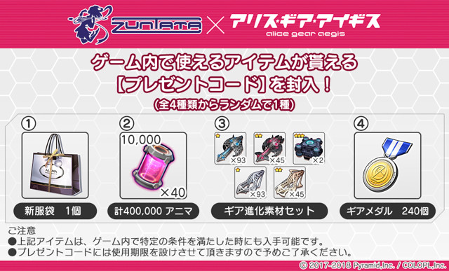 また、初期生産限定特典として『アリス・ギア・アイギス』のゲーム内アイテムが手に入るプレゼントコードを記載したカードが4種の中からランダムで1枚、