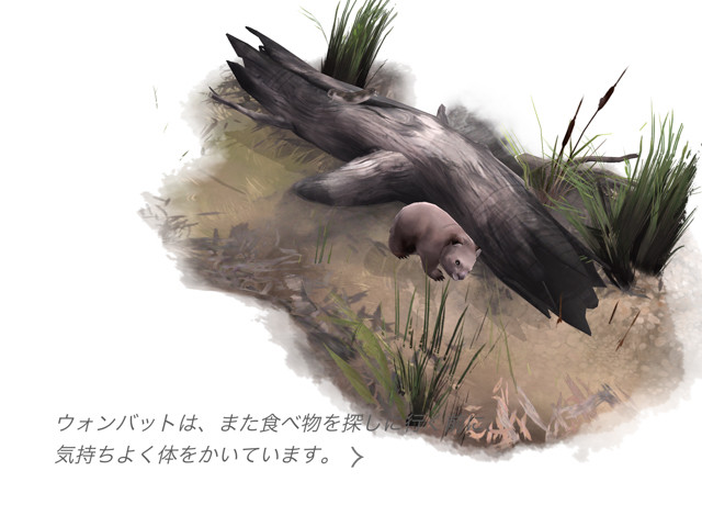 そして、一定の場所まで移動するとナレーションが入ってウォンバットの行動を説明し、またウォンバットが歩き始める。