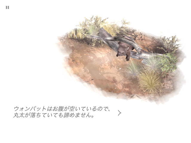 動物特番などでマスコット的に扱われるウォンバットの良さが、完全にアプリに封じ込められているのだ。『カユプテの木』をカテゴリするならアドベンチャーゲームに入るはずだが、実際は「森の中でウォンバットを動かせるお散歩絵本」と言ったほうが適切だろう。