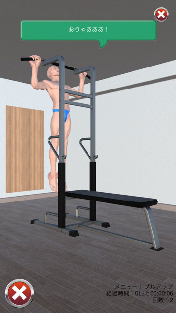 トレーニングメニューをきめて、放置して時間がたってから見ると筋肉が肥大化し、最終的に自分だけのマッチョが手元で育つ「放置育成ゲーム」ですね。