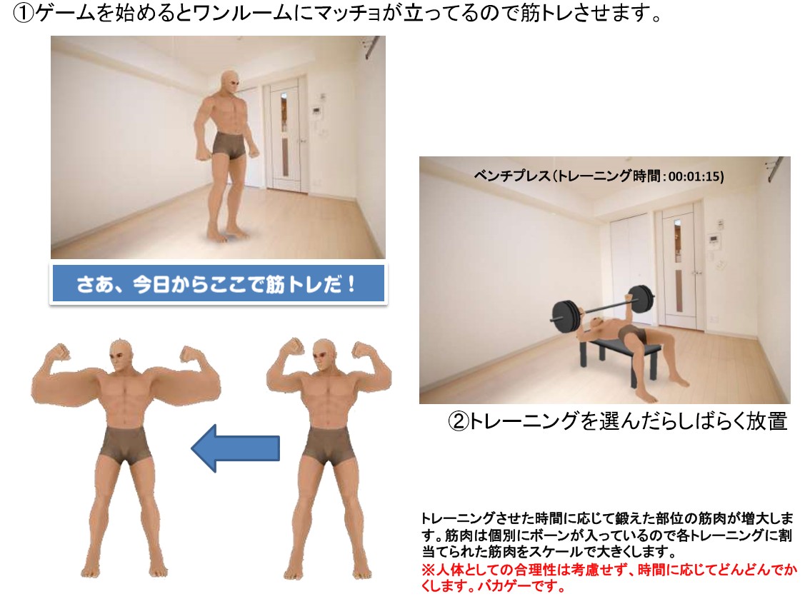 ▲マッチョGoGoGo企画書より。筋肉肥大の仕様はだいたい決まっているが、それを元にプレイヤーにどんな体験をさせるかのレベルデザインは苦労したという。