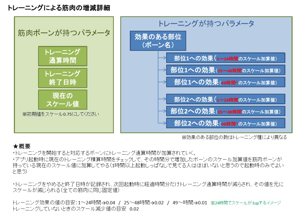 筋トレで筋肉がどれぐらい増えるのか、やっていないときにどれぐらい減るのか、課金アイテムどういう効果があって、どういう入手手段があって、とかそういうところですね。