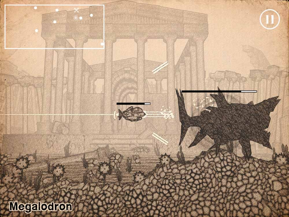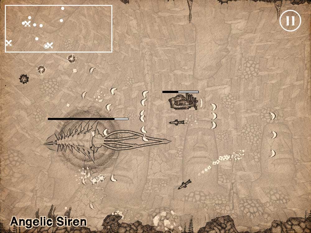 鉛筆画風の海底世界で潜水艦を操って戦うシューティング