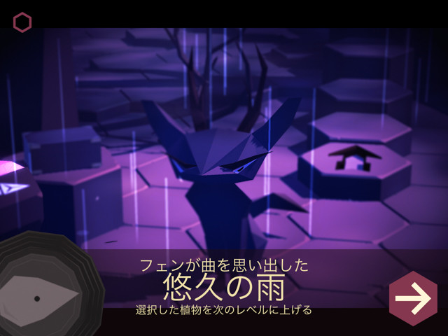 プレイが終わると庭のすべてをキツネ(?)がエネルギーとして吸収してスコアが産出され、石柱(6段階目に到達した植物を合成すると柱になる)から物語進行に必要なキーアイテムが出現する。